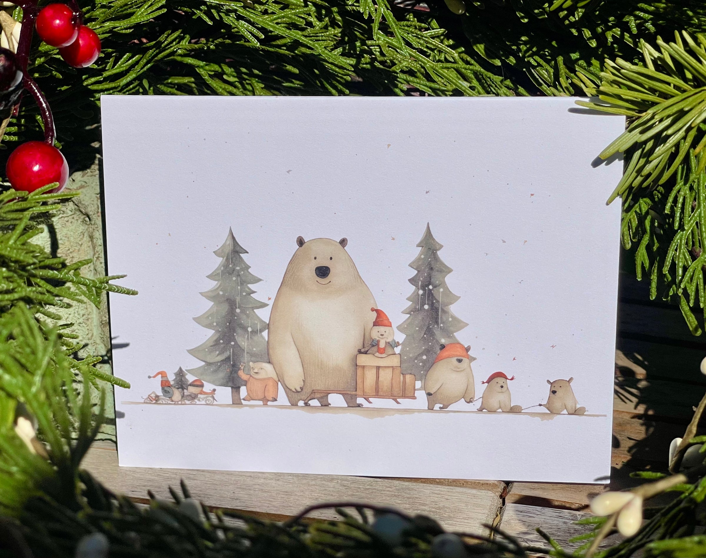 Perfect for the holidays, these cards with their joyful, whimsical artwork will make your seasons greetings a little more special. Our cards are printed on premium 17.5 pt matte paper, giving them an elegant finish. All cards are blank on the inside, perfect for writing your message, since you say it best. All cards come with kraft paper envelopes. Available as a boxed set of 10 different images. Size is 5.5” x 4”. Box set is packaged in a kraft paper box with an open window (plastic-free). Makes a thoughtful gift.